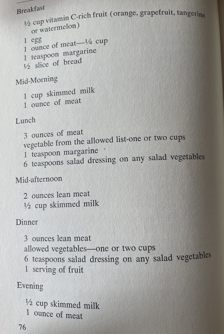 Leaving aside the image of a "quarter-cup of meat" at breakfast, this diet recommend that three times a day. Since the suggested menu consists of six meals, fully half of the meals you're expected to sit down to every day will include nothing more or less than milk and meat. It's like an all-Esau diet. All that varies throughout the day is the milk-to-meat ratio. (And why "six teaspoons" of salad dressing for lunch? Why not two tablespoons, which is the same thing? That's like saying "Six-twelfths of an apple" instead of "one-half".)