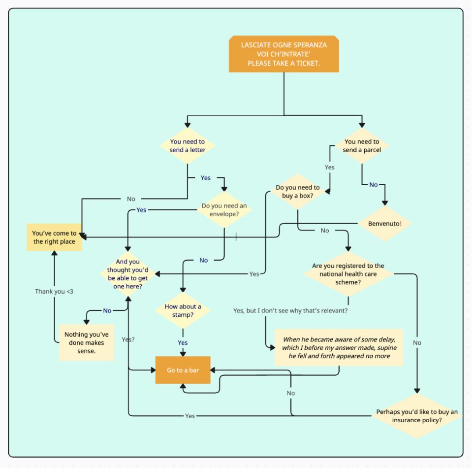 I’ve been to the DMV, I’ve waited for hours in the room at JFK, La Guardia, George Bush Intergalactic, Vancouver International, London Gatwick, and Kingsford Smith. I’ve sat on hold with Bank of America. All baby levels. Poste Italiane sits apart from these other administrations, towering over them like the Rainbow Road level of Mario Kart and just as likely to send you over the proverbial edge.