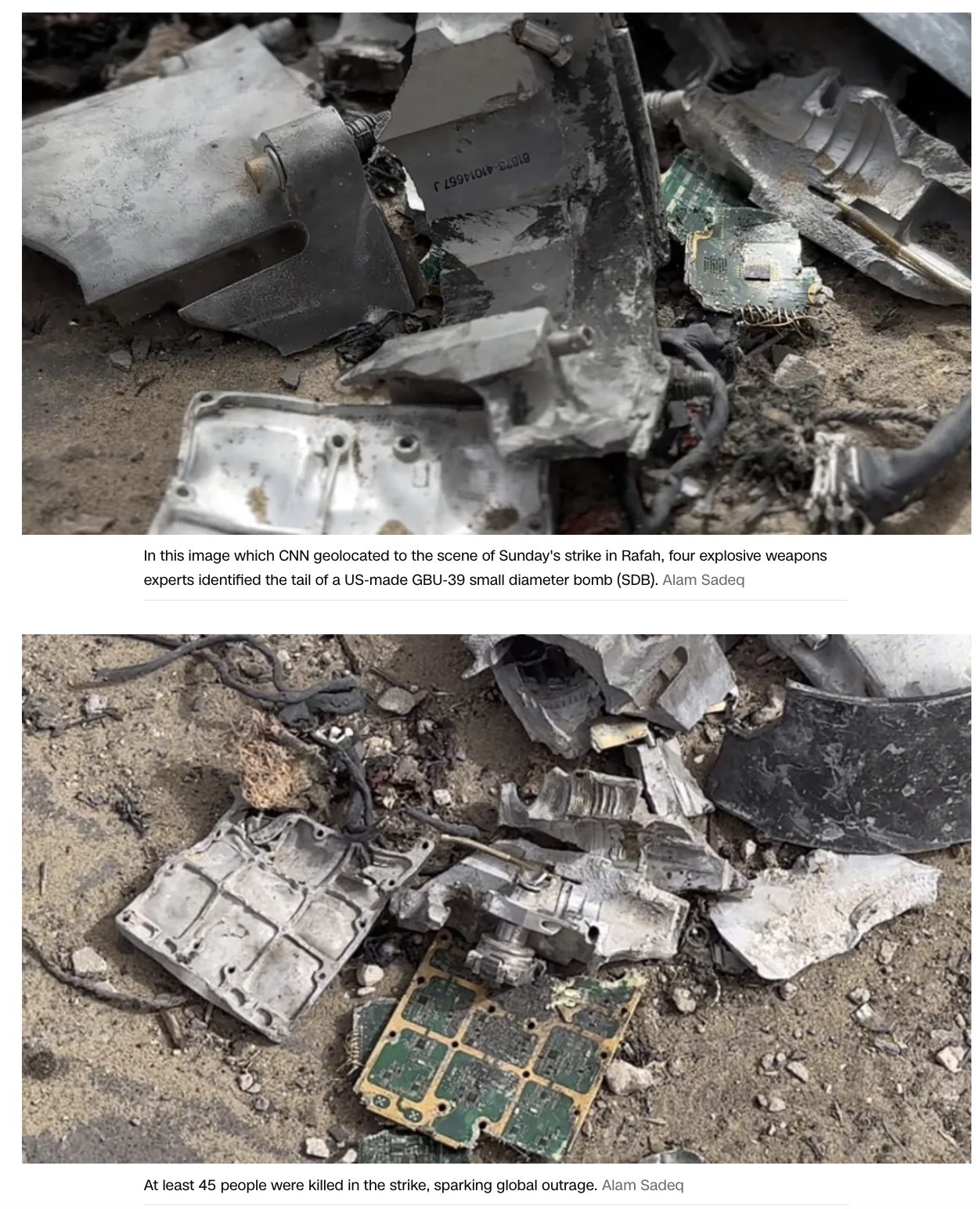 Last night CNN published their analysis of frames from videos shared on social media from the aftermath of the horrific strike on “Kuwait Peace Camp 1" in Rafah by Israel, then verified their geolocation. In consultation with a former US Army senior explosive ordnance disposal team member named Trevor Bell and British Army officer Chris Cobb-Smith, they have identified "the tail of a US-made GBU-39 small diameter bomb (SDB)," made by Boeing.