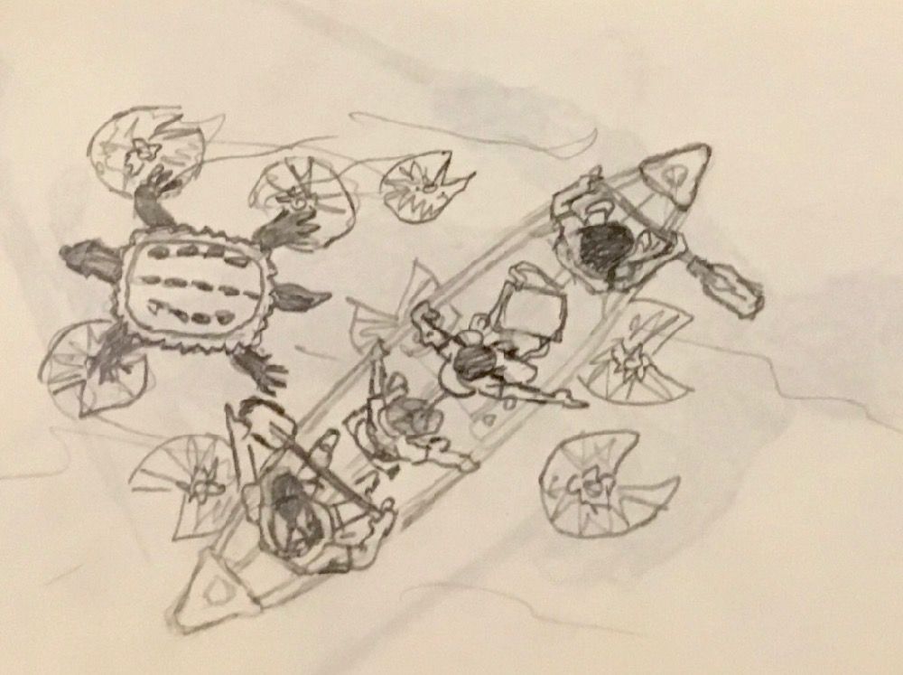 My youngest was in the bow, my wife was behind him, paddle in hand, then my older son sat behind her, using our little blue cooler as a seat. I was in the stern, paddling and steering. As we crossed over an area of submerged water lilies, my wife and kids were looking right but my attention was pulled in the other direction by some people on shore, loitering around a little stone bridge. I thought one of them might jump off the bridge into the lake, which I didn’t want to miss. When that didn’t happen I turned my attention back to paddling.